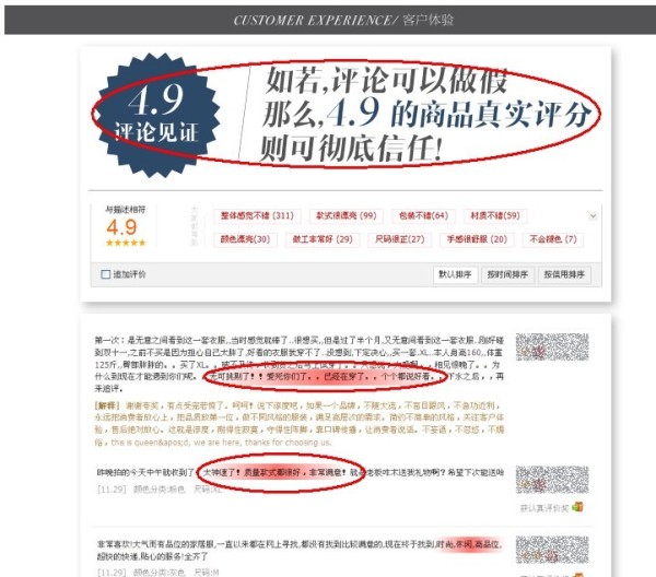 这个宝贝是我找的一个卖家的描述页,这个卖家很好的把评价展示了出来,并且用明显的标记把买家的评价里的噱头标了出来。