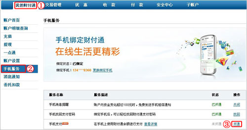 第一步:登录财付通网站,点击“手机服务”=》“手机支付”右侧的“开通”;