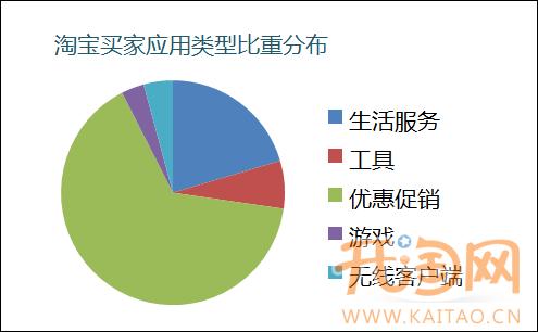 淘宝买家应用主要分为生活服务、工具、优惠促销、游戏、无线客户端五大类,其中优惠促销类应用拥有600多款,生活服务类应用拥有200多款,两者占据了80%的数量比重,具体如下图。