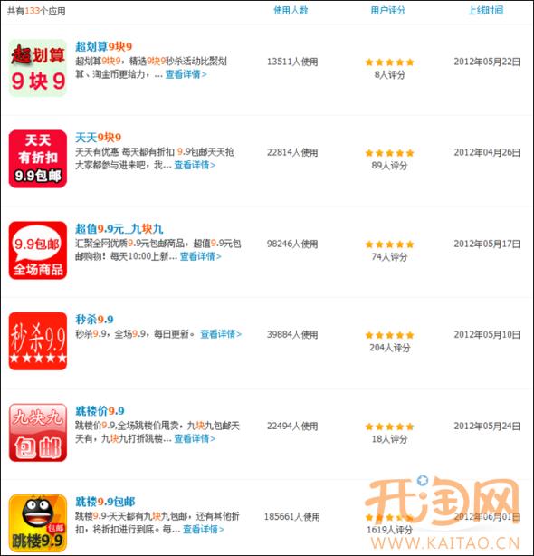 4、优惠促销类应用目前占有最大比重,这本来是一个很好的市场,结果开发者搞乱了,各种1元、1折、秒杀、包邮、免费送充斥着这个栏目,光9块9的应用就有133个,鱼龙混杂,眼花缭乱。这种应用只适合打造爆款,您如果有这种9块9包邮、一折之类的商品要推广可以选择这个栏目,我要提醒的是管买家应用的淘宝小二对这一块的流量、广告资源位已经开始限制。