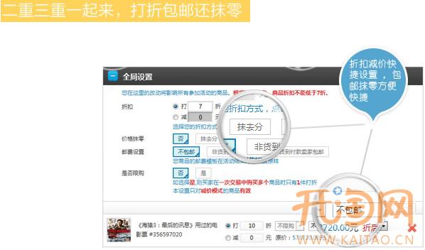 口碑最好的淘宝营销软件!任意折扣限时打折(完美支持7折以下)、节日促销、包邮、部分满就送,活动时间随意设定不限时长。1分钟上手!更有微博营销、专区推广等特色功能,帮您增加流量、提升营销效果。