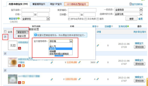 第二步,选择您想报名参加1212的宝贝,点击“橱窗推荐——橱窗设置”,选择合适的宝贝设置为橱窗推荐做好报名前的准备工作