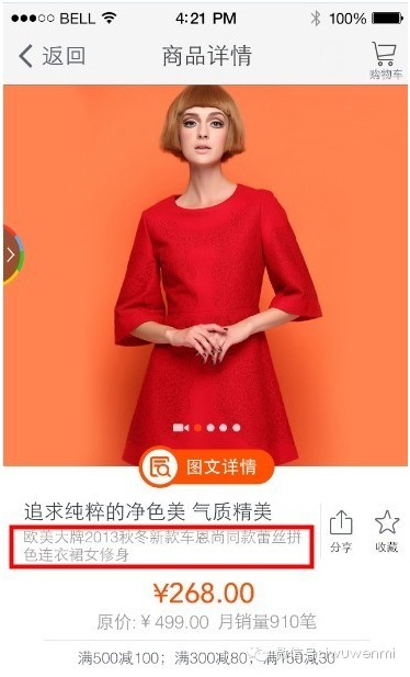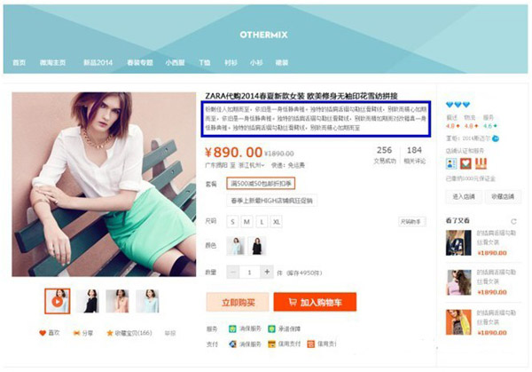 “宝贝卖点”的位置在详情页宝贝标题下方展示,而手机淘宝则在5月底新版本上展现。由于手机屏幕大小的原因,只读取卖点的前30个字进行展示。而且了解得知,此次淘宝商品详情页的改版,仅是对主图的尺寸进行了修改,从原来的460*460,修改到400*400。淘宝方面建议卖家上传500*500以上的大图,这样,买家就可以使用放大镜功能查看主图。