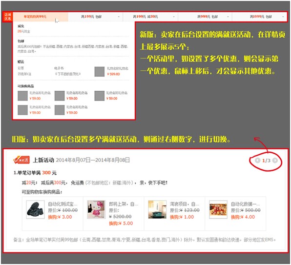 改动点一:如果一个卖家同时设置了满就送和搭配套餐,那么新版的显示样式将会更改。