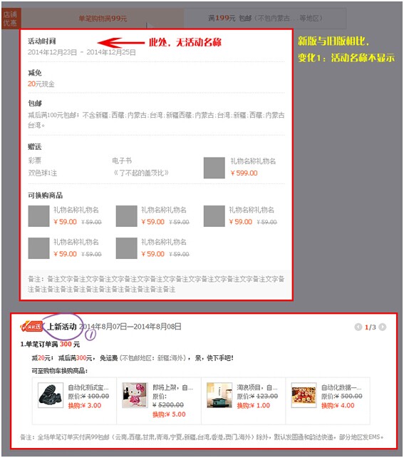 改动点三:卖家设置的“满就送”活动,在详情页展示时,活动名称不显示。