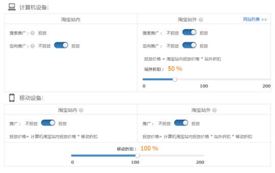 1)单独测试PC端与移动端淘宝站内互联策略。关闭PC端与移动端淘宝站外,加大移动端推广的力度,这可以降低PC端宝贝关键词的出价,通过提高移动折扣的形式来调整权重。