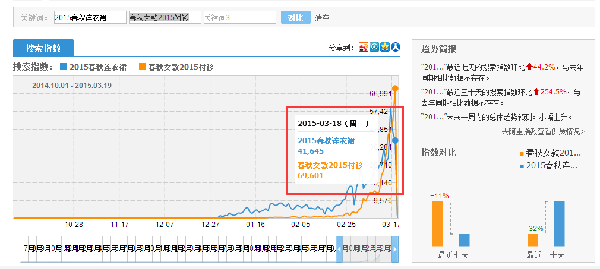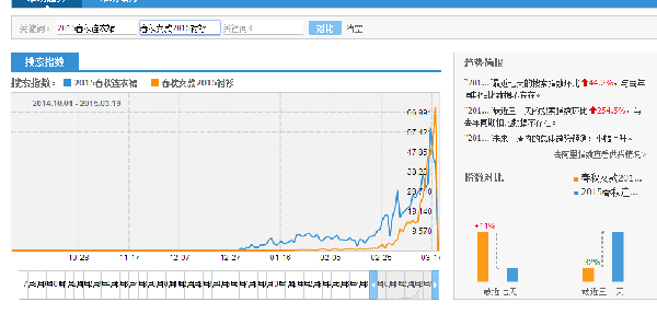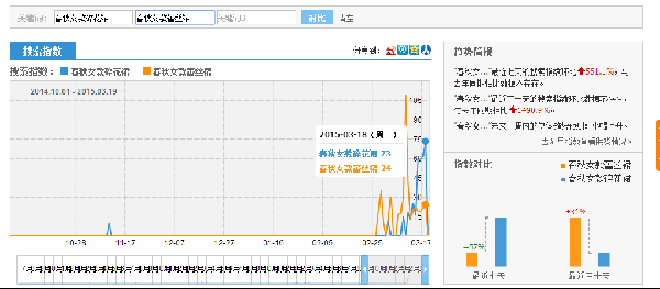 图3我们选择了“2015春秋连衣裙”与“春秋女款2015衬衫”对比,它的搜索指数是从2014-10-1至2015-3-19的,从图中右边指数对比中可以看到最近七天衬衫比连衣裙要高出11%。