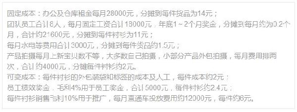 对淘宝店来说,固定成本主要包括办公及仓库租金、员工基础工资及年底奖金、产品拍摄费用、水电等费用、固定资产投入(比如桌椅、电脑)、进货物流成本、税金。可变成本主要包括员工绩效奖金、商品辅料及包装、营销推广费用、退货成本、交易费用、物流费用;再加上不定期去库存进行的包邮、折扣、买赠、满减等促销活动产生的费用。