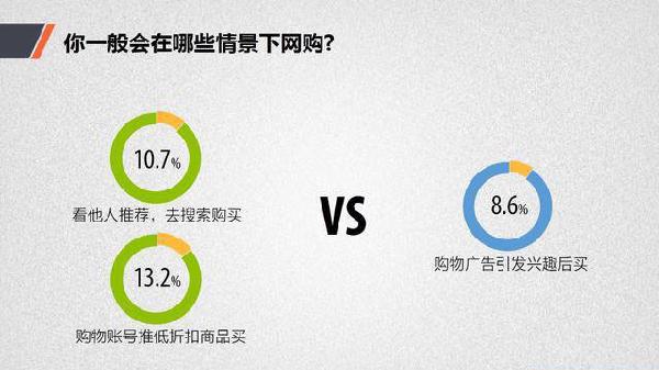 购物类社交账号推荐的低折扣商品 , 会引发 13.2% 的网民产生消费冲动。社交网络中其他人推荐的商品 , 会引发 10.7% 的网民进一步了解购买。这两条因素均高于因广告引发的购物行为。