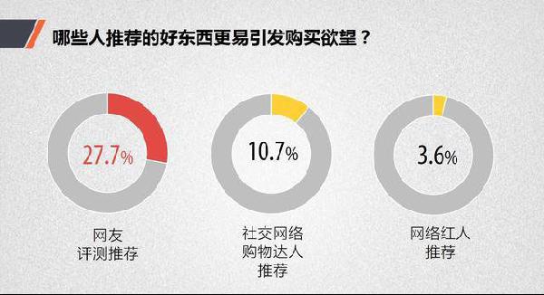 在那些经常通过他人推荐来购买商品的用户中 ,27.7% 的人更认可网友评测 ,10.7% 认可购物达人。