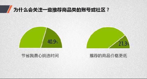调查中 ,23.6% 的用户有关注这类商品推荐的社交账号或社区。在这部分人群中 , 他们关注的动机核心是 " 节省我费心挑选商品的时间 ", 占比为 40.9%。其次为了解一些不知道的商品 , 或者是推荐的东西符合喜好。