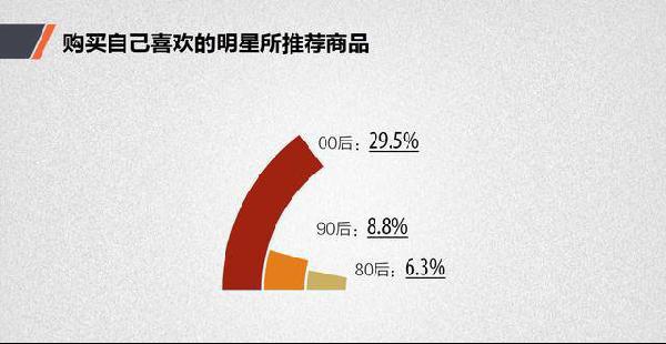 因为喜欢的明星推荐 , 而选择购买该商品 , 这一行为在 00 后用户中占比为 29.5%, 但在 90 后和 80 后中的占比仅分别为 8.8% 和 6.3%。