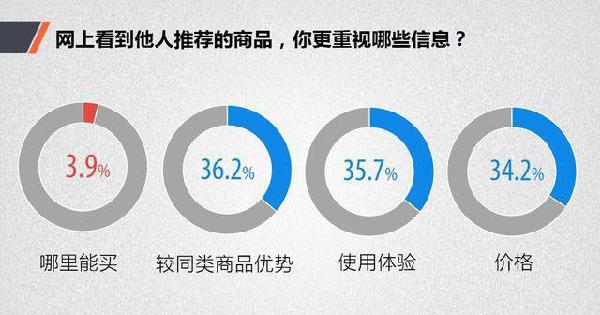 如果向用户推荐好用的商品 , 那么你最不需要告诉他们的可能就是 " 哪里去买 "。这在用户的关注中排名最低 , 占比仅有 3.9%。