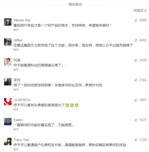 这里,小编给大家截取了一部分微信用户留言,如下图所示,可见每一次微信平台的更新,都是从用户体验角度出发,越做越好。期待更多微信功能的开发!