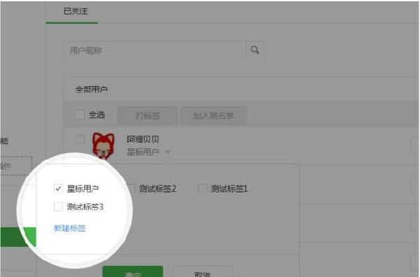 运营者可登录公众平台后台,点击左侧菜单“用户管理”后管理已关注用户,点击其中一个用户右侧的“标签”小角标可弹出复选框快速为该用户添加标签,且添加标签复选框内已支持直接新建标签。