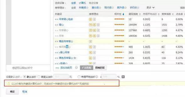 变化点1:在添加关键词页面增加默认出价备注:以上价格为关键词计算机出价,无线出价=关键词对应计算机出价*无线折扣。