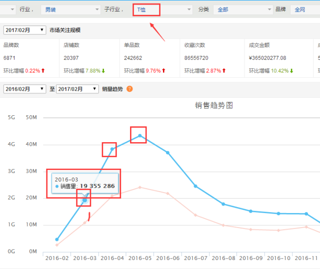 (2016年2月-2017年2月 “男士T恤”销售走势)