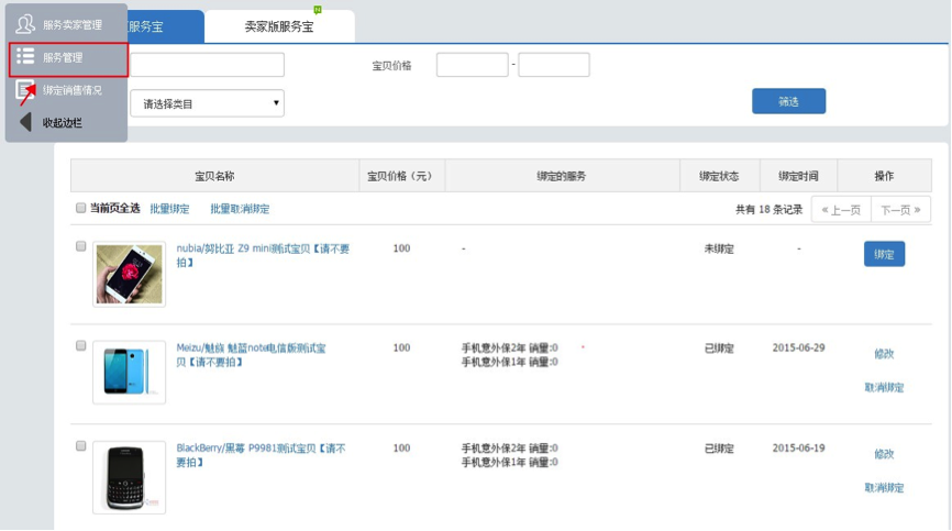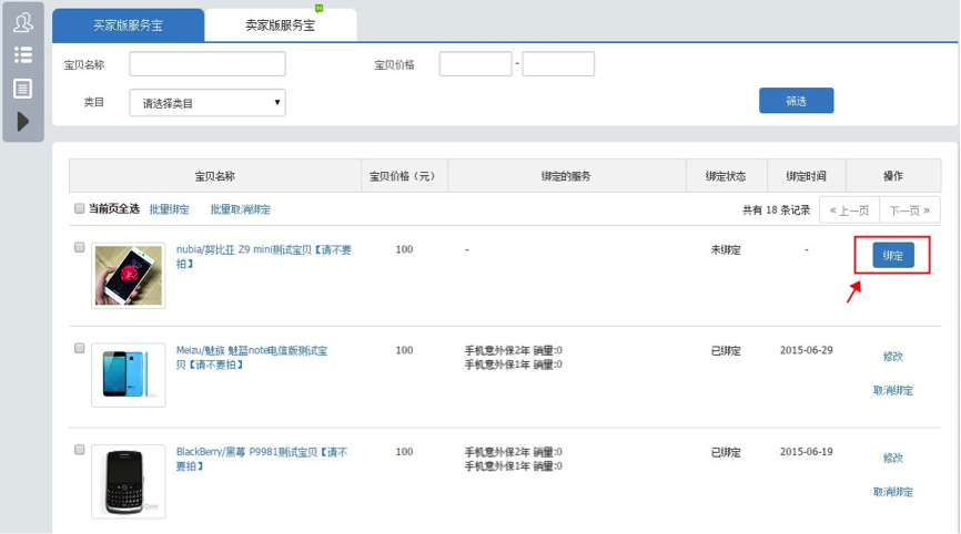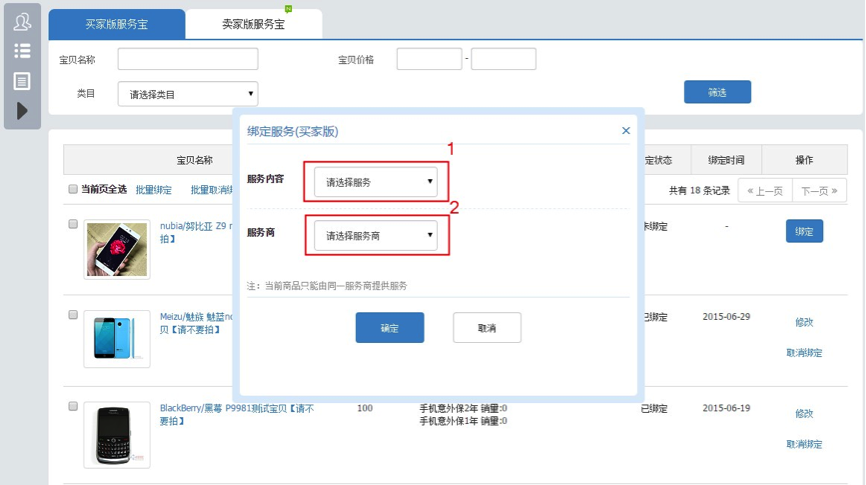 (商品列表只显示店铺内可绑定相关服务的商品)
