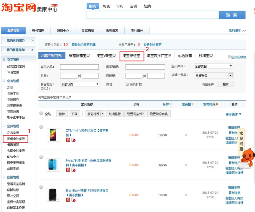 A. 在卖家中心中选择左侧菜单【宝贝管理】—【出售中的宝贝】,再选择【淘宝服务宝】点击进入服务宝页面;