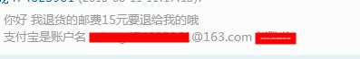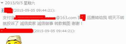 支付宝 shikozj4*48@163.com*辉 运费转给我下 明天不转就投诉了 诚信卖家 诚信做事 谢谢!
