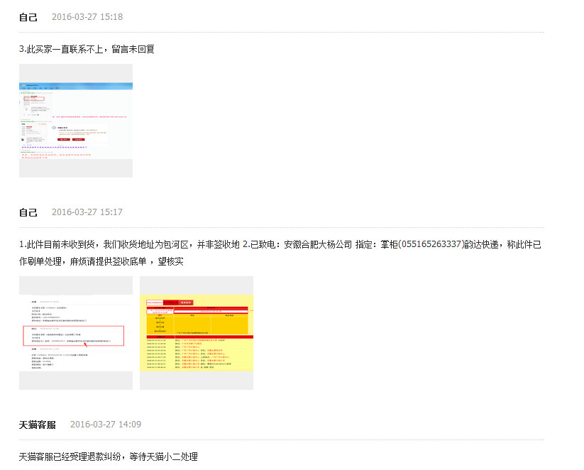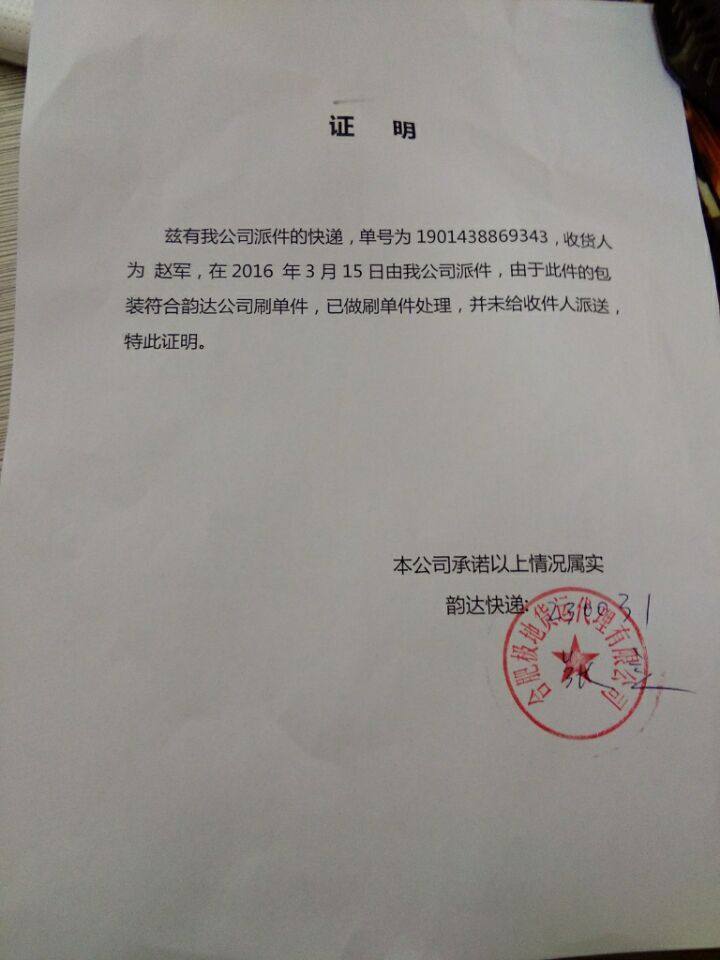 作为收件人的我们,没有收到货还得自己去找快递要证明,我也只能呵呵了。好不容易找到韵达那边要到证明,反馈多个小二,竟然没有结果。。