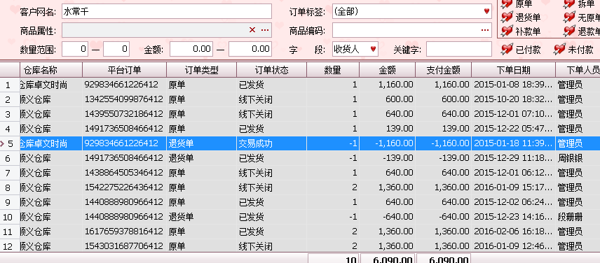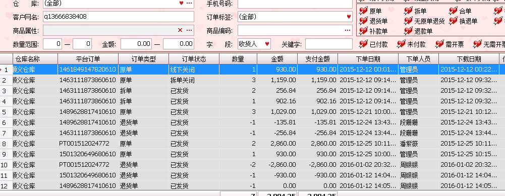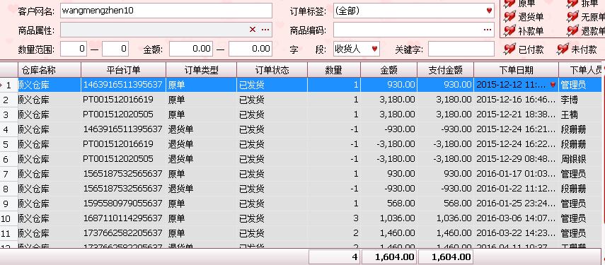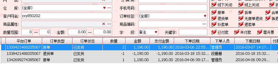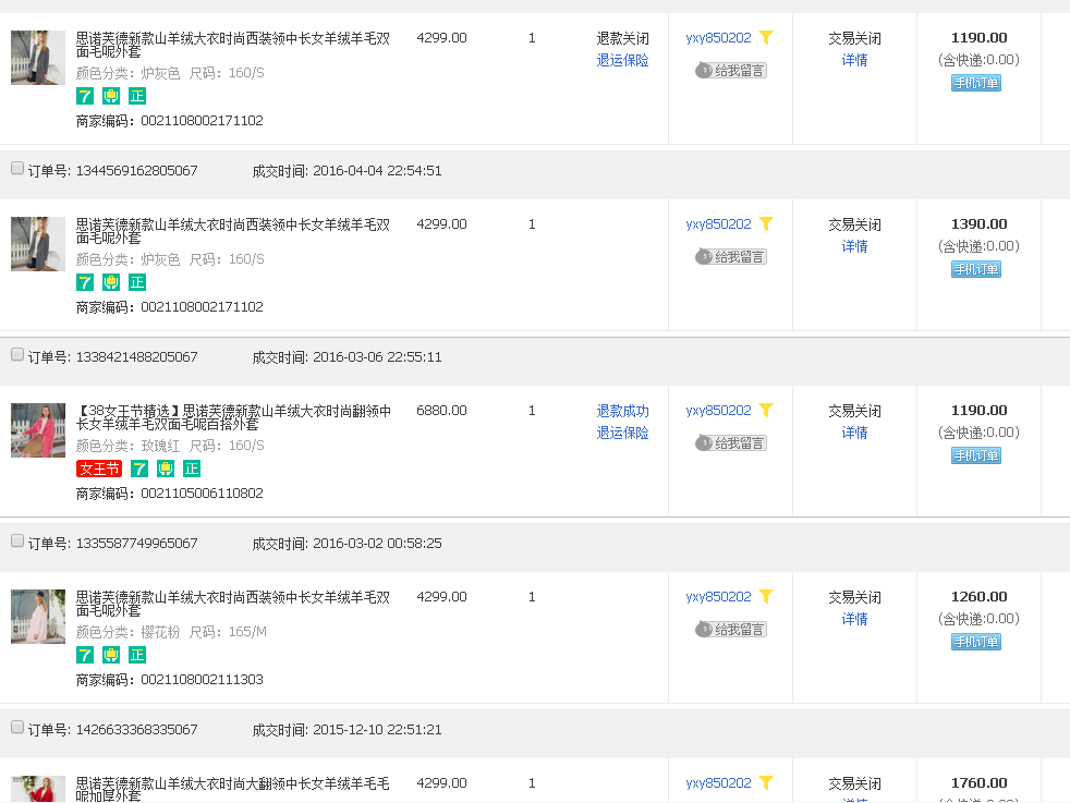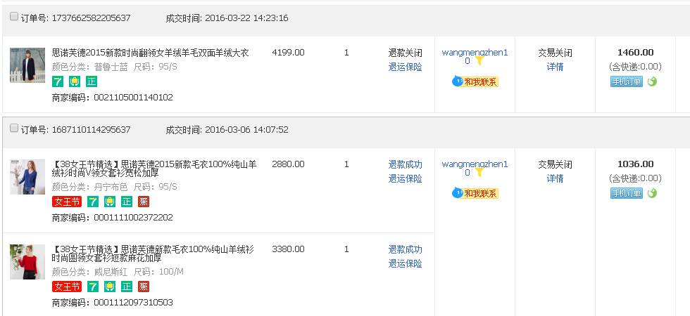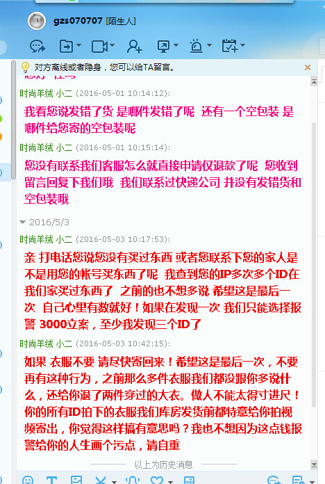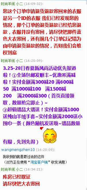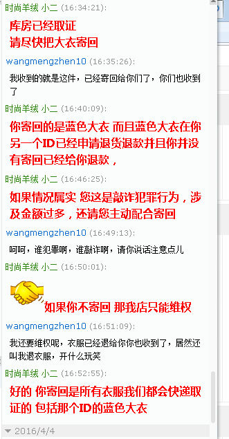 ??重点骗术来了:他们的主要诈骗一般是多个ID,一个主ID,多个小ID一次性买很多衣服,金额偏低些,会大量购买,上面的系统截图大家看到了购买记录,然后用主ID购买金额过贵的或者商品,收到货后联系商家谎称发错货甚至是空包裹,大家都应该遇到过买家说你发错货的吧,或许你都不知道这是骗术,然后要求换货或者退货退款,仅退款!重点是它们还理直气壮的给你拍照,当然 拍的是之前小号买的衣服,我们家发货还会打印订单明细寄出,他们还会拍照明细,商家看了会以为真的发错货。接着按正常流程退货退款,就这样损失利益,还上升了退货率和售后指标下降!