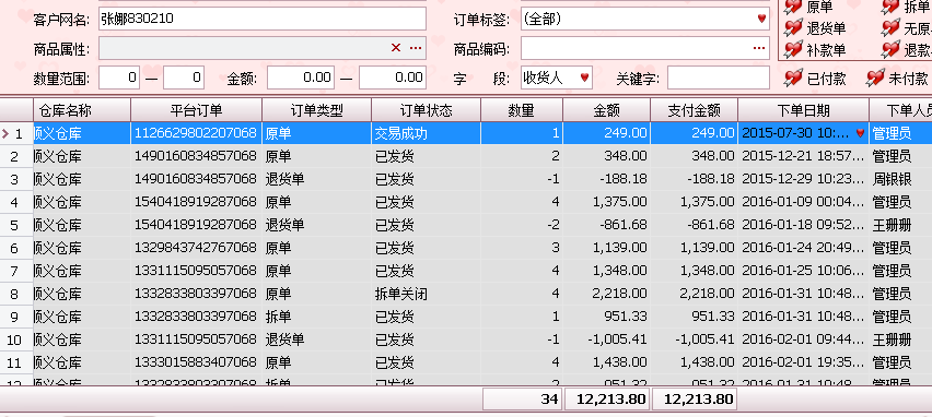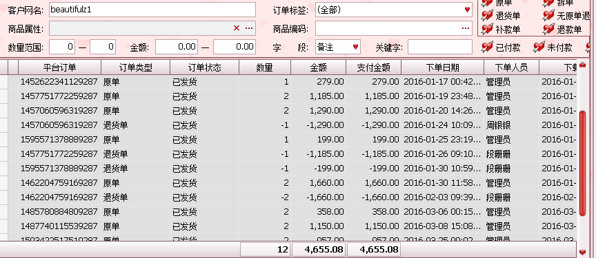这是这两个ID的购买记录,(原单是它拍的,退货单是它申请的退货,已经退款的,卖家应该都看得懂)心细的朋友会发现 右边的下拉条并没有到底,这只是一部分而已,这些不是重点,重点是这两个ID是同一个人!