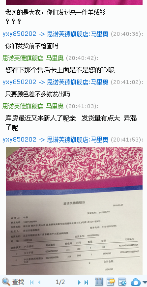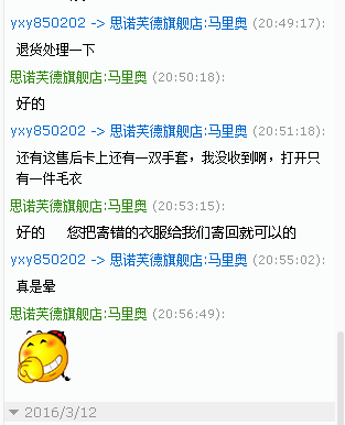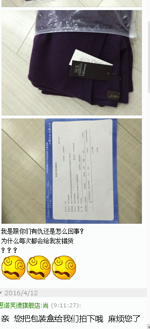 ? 货收到了,继续C尼马啊!商标是唯品会的,重点来了哈:大家都知道 搞电商的,会有多个平台出售商品,思家在唯品会也有,这位亲就是在唯品会上买的一件羊绒衫,然后来思家买大衣,收到货后说我们发错货,哎呀我去,万万没想到啊!但是。。。出库都是从库房出,弄错有可能,我还是抱着炸它一把,给它打了个电话,我说您的退货收到了,您说发错货了,我们收到的商品商标代码可是唯品会的啊,您是不是搞错了呢,家人有没有在唯品会买过呢,她死活说我们发错,我问它,那就奇怪了,那绝不可能啊,我们天猫库房不出唯品会的商品,怎么会寄错的呢,这个不是我们平台的东西啊亲,我们只能拒收,您问下家人吧,并让它把正确的商品寄回,当时说话很强硬,一点也没客气,它没底气的说给它寄回吧,自己在看看是不是搞错了,至今也没在联系我们!