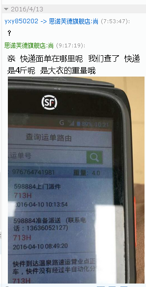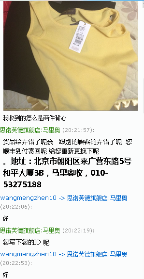 你好过分哦,拍的两件大衣,价格三千多,你说我发你俩个吊带,哦哦哦 。。。真的要爆了199*2吊带398,你这样搞,你家人支持你吗,一窝蛀虫!然后有一天同事跟我说怎么总给她发错,我看了聊天记录后觉得不对,就查了电话和地址,果然啊,