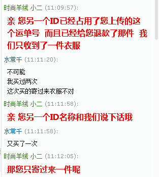 ??另一个ID已经把我拉黑了 截图不到记录了,唉。。。。此人还用一个运单号填写两个ID的退货订单,?所以!!!在此再次提醒各位商家,尤其是大店,切勿不要只看运单物流显示签收信息就退款!!!因为它多个ID同时申请退货,但只填写一个运单号!切记切记!!!血一样的教训啊
