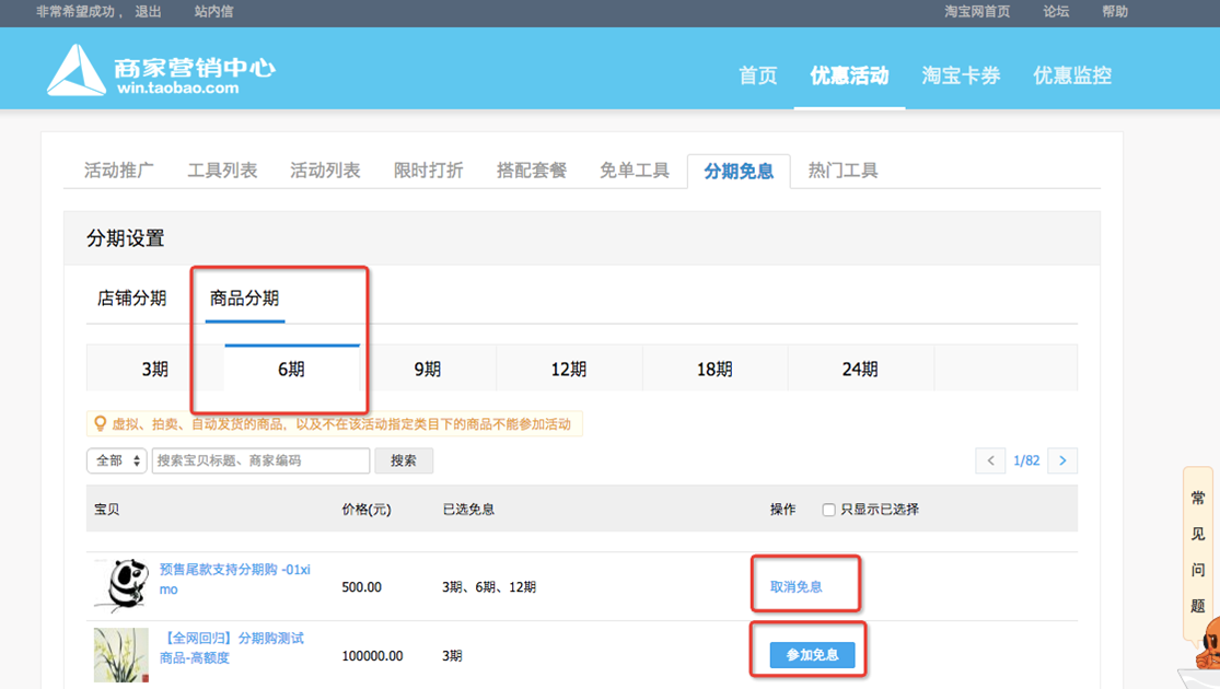 Step4:选择“商品分期”中某商品对应的“参加免息”或者“取消免息”,并点击页面最下端的“提交”按钮后即完成相应商品所对应期数的免息设置
