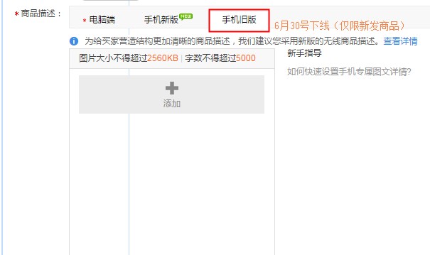 亲爱的天猫商家,通过前期数据监控,无线详情的“手机新版”在展示效果和成交转化上都比“手机旧版”更好。所以,为了给买家营造结构更加清晰的商品描述,我们建议您采用“手机新版”且“手机旧版”将于6月30号下线。注意:仅限新发商品,之前发布的商品不受影响。 请您注意下线时间并提前做好准备。